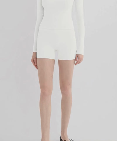 מכנסי טייץ קצרים בעיצוב דו-שכבתי קליל, שמעניקים נוחות ממכרת וחופש תנועה לאורך כל היום. המכנסיים עשויים בד חלק ונעים במיוחד, ללא תפרים, למגע מלטף על העור. פריט בסיס אידיאלי לשעות הפנאי, שיכול להשתלב בקלות גם במראה רב-שכבתי מתוחכם. דגם זה מעוצב בגוון לבן פנינה בהיר ורך, בהשראת קרני אור שפוגשות בקו המים.